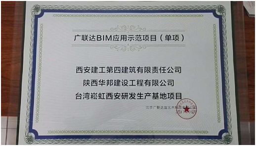 由西安建工(集团)第四建筑工程有限公司和陕西华邦建设联合在台湾淞虹西安研发生产基地钢结构工程BIM技术应用,获北京广联达科技公司西安“BIM应用示范项目”荣誉,授予公司总经理行础“BIM佳应用实践者”称号。