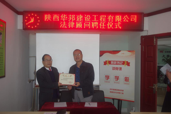 10月15日上午,聘任法律顾问仪式在公司会议室隆重举行,总经理行础代表公司向陕西帝意律师事务所律师雷永定颁发聘任证书,双方签字聘用合同。聘任专业律师加盟华邦团队,势必为规范公司管理,防范商业风险,建设“节能钢结构专家”奠定坚实基础。