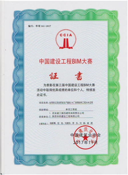 12月21日,在福建厦门召开的中国建筑业协会“建设工程BIM技术成果经验交流暨协会首部团体标准发布会”上,我公司与西安四建联合在“台湾崧虹西安研发生产基地1#钢结构厂房工程”项目BIM应用荣获《单项三等奖》证书,柏新博、钮旭、刘鹏华等六位同志颁发个人荣誉证书。