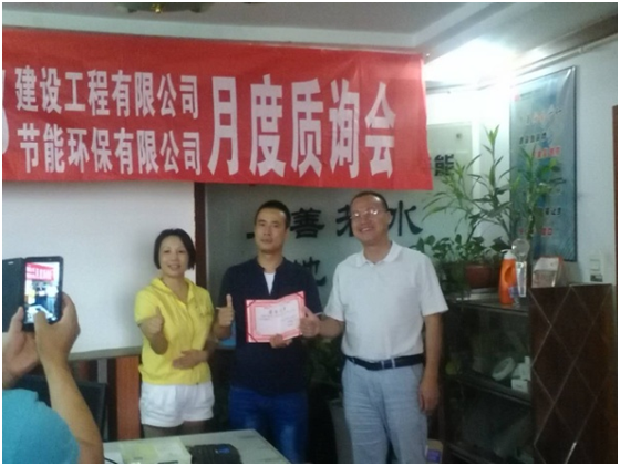 九月三日,公司八月份月度质询会如期召开,与以往不同的是,今天的会议增加了研讨(改善)会和表彰会二个环节,这是经过一个月来的系统优化升级带来的新变化。研讨会主要是针对一个月来工作所暴露出来的问题与不足,进行总结分析,制定措施,明确任务,增强信心;通报表彰在营销、项目管理、配合服务以及文化传播方面涌现出来的优秀员工,弘扬奉献精神,传播公司文化,使全体员工学有榜样,赶有目标。“梅花队”荣获八月份“品牌分冠军杯”,赵卫斌、任战龙、董宝钱分别获得优秀员工奖,公司总经理行础向他们颁发了奖杯与奖状,并合影留念。