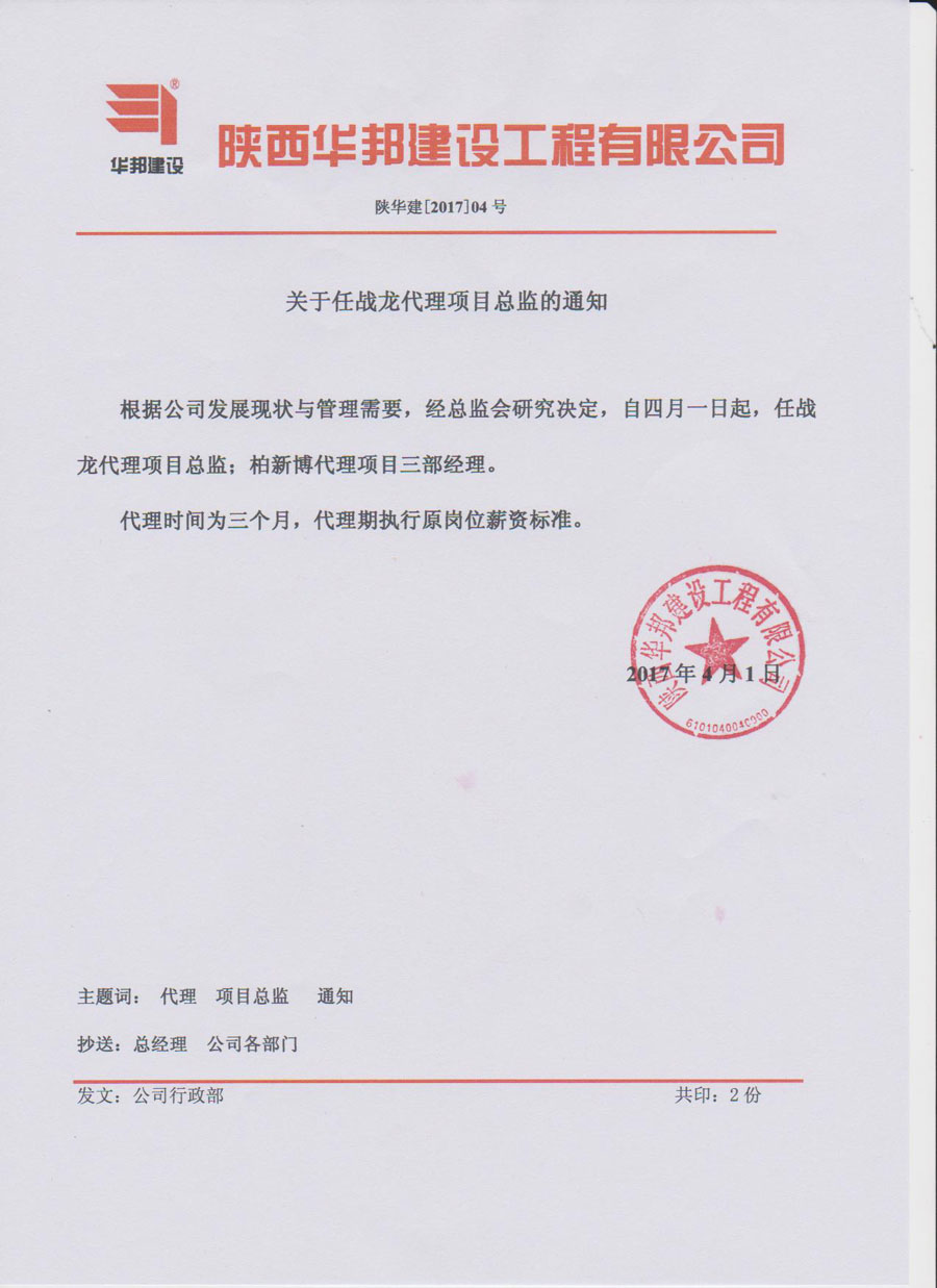 关于任战龙代理项目总监的通知