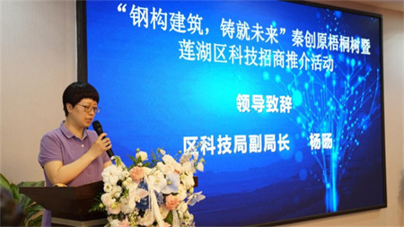 莲湖区科技局副局长杨旸首先致辞。她代表区科技局对参会的高校、企业和专家学者表示诚挚问候和衷心感谢。她强调,莲湖区是全市重要的建筑业企业聚集区,企业创新能力强,校企合作活跃,科技成果转化数量多。为贯彻落实全省“三个年”和全市八个新突破,助力西安双中心建设成形起势,区科技局会不断开展科技扶持政策和相关培训活动,积极搭建产学研合作平台,促进优势科技成果转移转化, 服务广大企业,营造良好的莲湖营商环境。