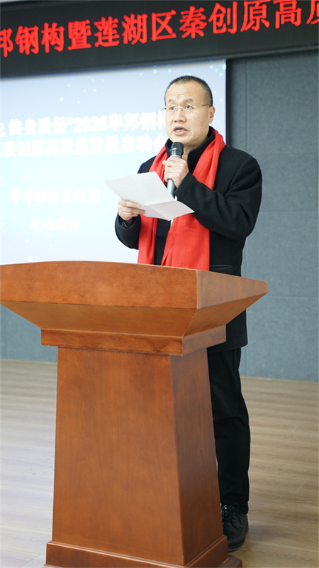 省金属学会钢构专委会主任委员、华邦钢结构总经理行础致辞,他首先代表钢构专委会及华邦钢结构全体员工,向莅临现场的各位嘉宾、各位业界上下游同仁致以最热烈的欢迎和最诚挚的感谢!他提到, 2月7日,西安市委市政府召开了推动经开区2025年高质量发展工作专题会议,这与今天的启动会非常契合,使我们更能坚定信心、鼓足干劲,为全市高质量发展贡献自己的力量。他表示,自2003年成立以来,华邦钢结构始终秉持“质量领先,终身质保”的核心理念,深耕钢结构领域,累计完成超百项标志性工程。2025年是华邦钢结构深化战略合作、推动技术升级的关键之年,公司将以“质量创品牌,安全靠预防”为方针,聚焦技术升级、服务深化、文化凝聚三大方向,推动钢结构智能化技术应用,优化“终身质保”服务体系,践行“上善若水 天地人和”的企业文化,打造专业、高效、担当的上下游一体化服务平台。同时,作为陕西省金属学会钢结构专委会主任单位,华邦将持续联合智库专家,推动装配式建筑、光伏一体化等九大领域的创新应用,还将参与发起既有建筑改建之检测鉴定设计施工一站式联盟,助力行业可持续发展。