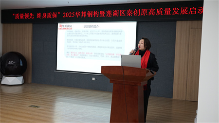 华邦钢结构副总经理曹青霞从市场环境分析、差异化战略优势、实施优势、质量领先路径、终身质保承诺等五个方面,带领众人一起展望“质量领先 终身质保”,并号召大家一起行动起来。