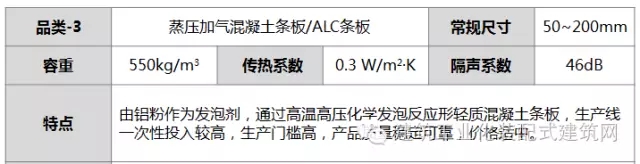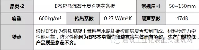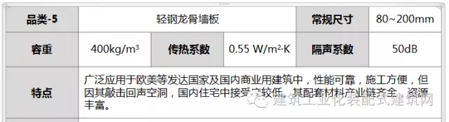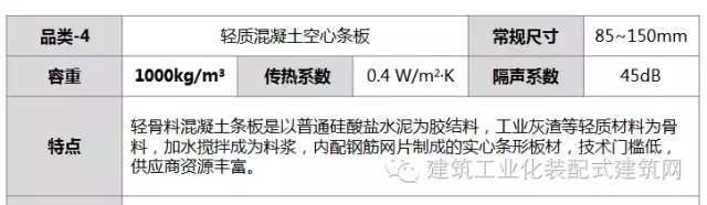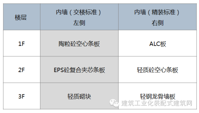外墙(4种):轻质砌块、ALC条板、EPS砼复合夹心条板、装配式轻钢龙骨灌浆墙体