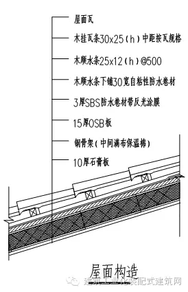 挂绿湖项目采用冷弯薄壁型钢桁架+保温棉+OSB板+防水构造+屋面瓦的做法。