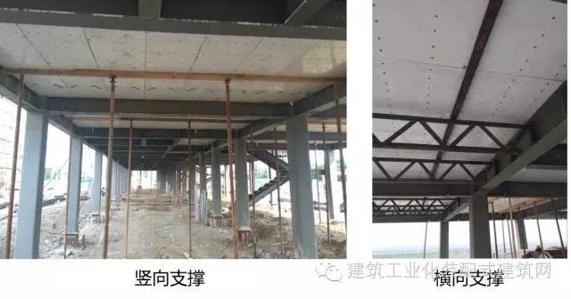 天津厂公寓楼楼板厚度为100mm,采用的楼承板桁架高度为70mm,其免支撑跨度为2.5m。部分楼板混凝土浇筑前底部设置了临时支撑,大部分采用竖向支撑,局部采用了横向小桁架支撑。